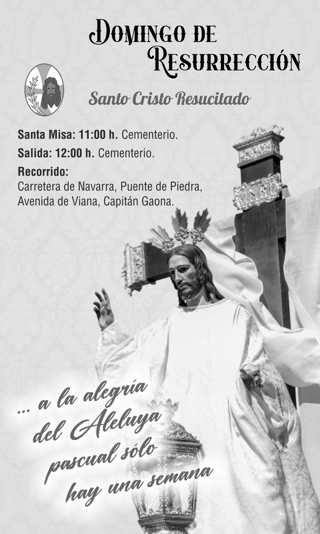 Al término de la misa, a las 12,00 horas, salida desde el Camposanto con el recorrido: Carretera de Navarra, Puente de Piedra, Avenida de Viana y Capitán Gaona hasta el colegio de la Compañía de María, donde concluye tanto el recorrido de esta procesión como la Semana Santa 2026 en la Ciudad de Logroño.
